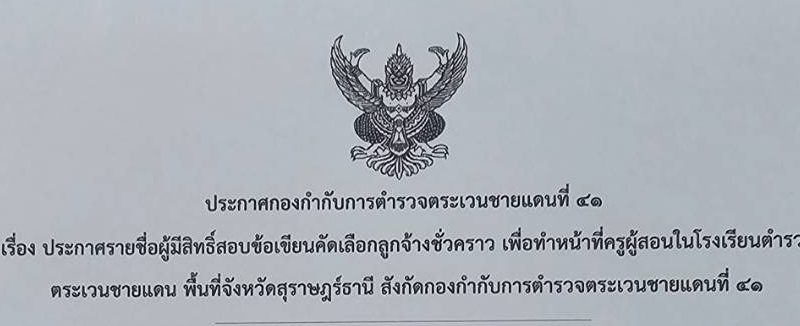 ประกาศรายชื่อผู้มีสิทธิ์สอบข้อเขียนคัดเลือกลูกจ้างชั่วคราว เพื่อทำหน้าที่ครูผู้สอนในโรงเรียนตำรวจตระเวนชายแดน พื้นที่จังหวัดสุราษฎร์ธานี
