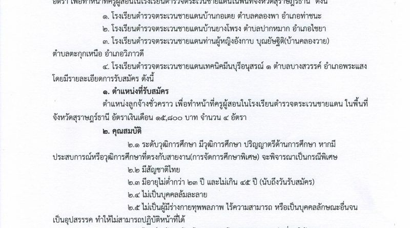 ประกาศรับสมัครลูกจ้างชั่วคราว เพื่อเป็นครูผู้สอนโรงเรียนตำรวจตระเวนชายแดน ในพื้นที่ สุราษฎร์ธานี